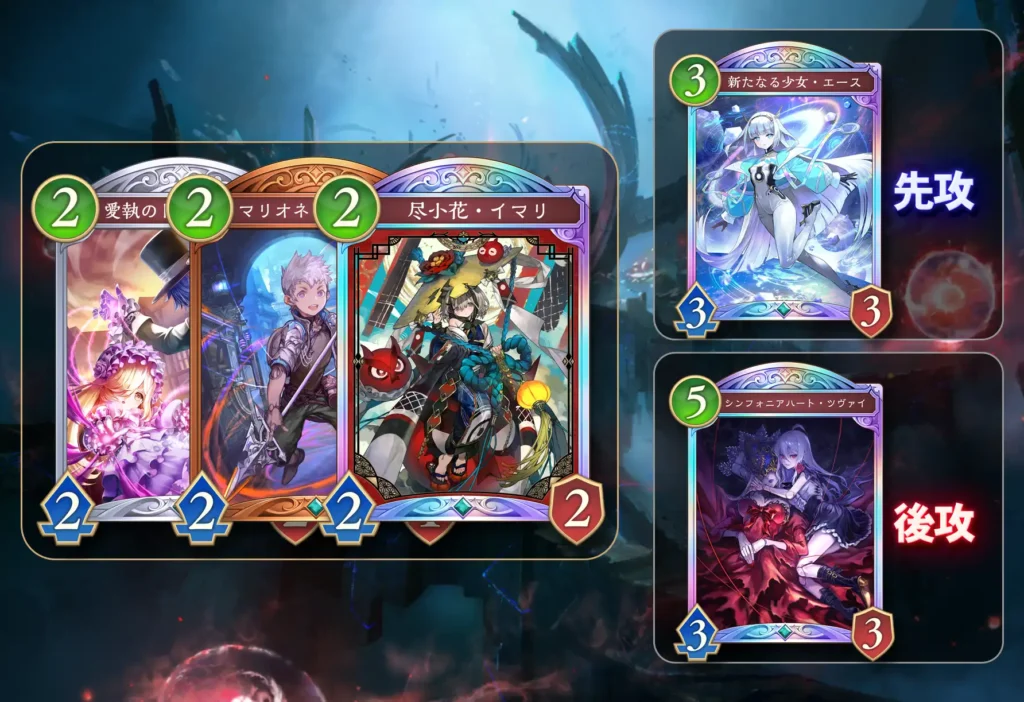 ・中盤 (4〜6ターン目) : 「尽小花・イマリ」や「シンフォニアハート・ツヴァイ」で盤面を強化し、相手のゴースト進化による打点を防ぎます。
