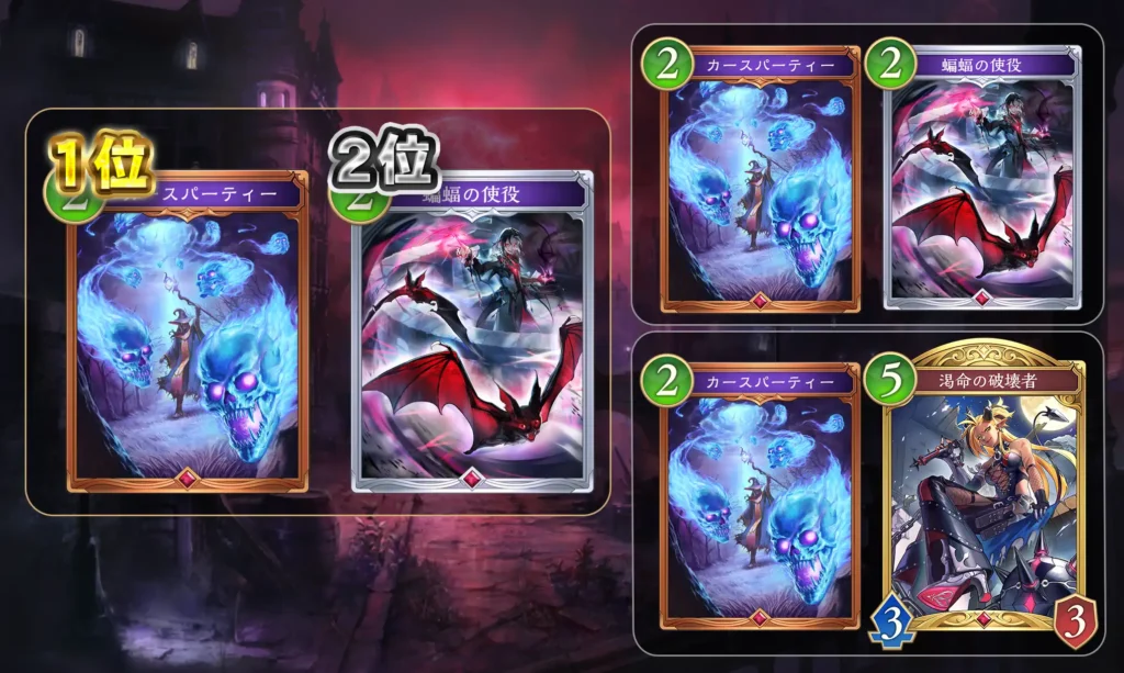 戦略 : 序盤は「カースパーティ」や「蝙蝠の使役」でミラー対面と思わせ、相手を盤面処理に付き合わせます。