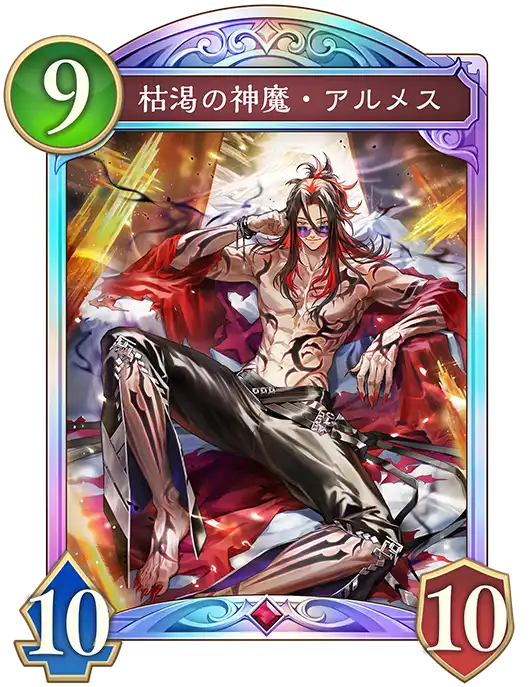 戦略 : 序盤から中盤にかけて、「腐臭のゾンビ」+「混融の団結者」による強力な盤面展開で相手を処理に回らせ、自リーダーへのダメージを最小限に抑えます。回復を徹底して「旧き天晶・カルギデンスラ」などの打点に対応しつつ、「枯渇の神魔・アルメス」の安着を狙います。相手の土が切れた後の「混融の団結者」超進化も有効です。
